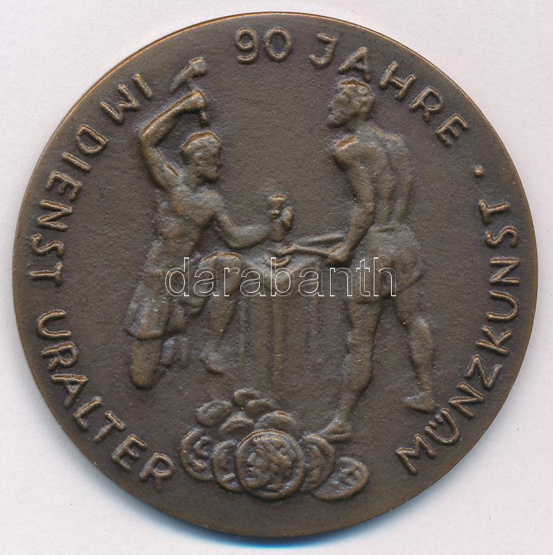 Description: NSZK 1960. "90 éve a pénzverés szolgálatában / Az 1960/61-es év fordulóján - A ház barátainak szentelve - B. H. Mayer pforzheimi művészeti pénzverdéje" bronz emlékérem (50mm) T:XF