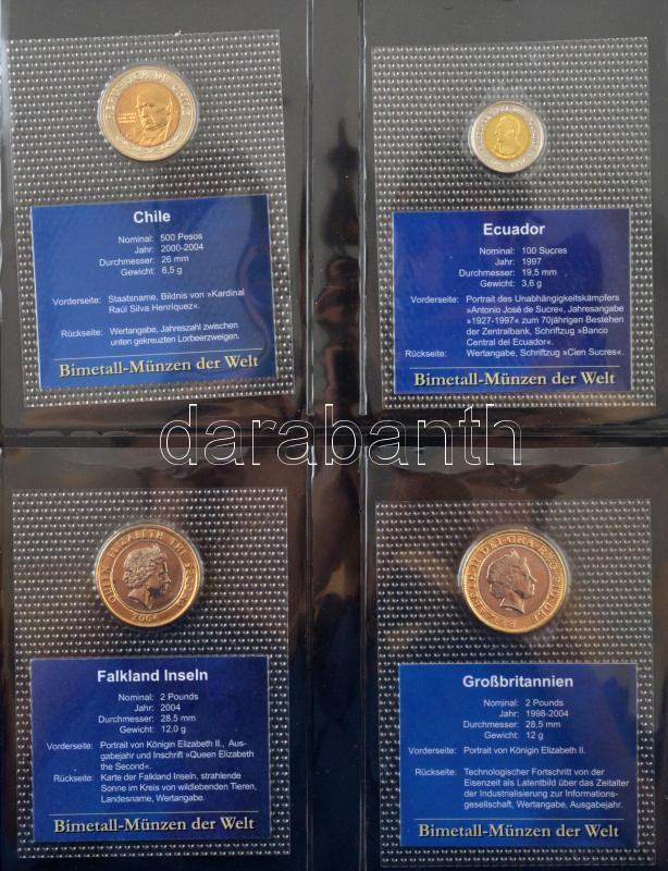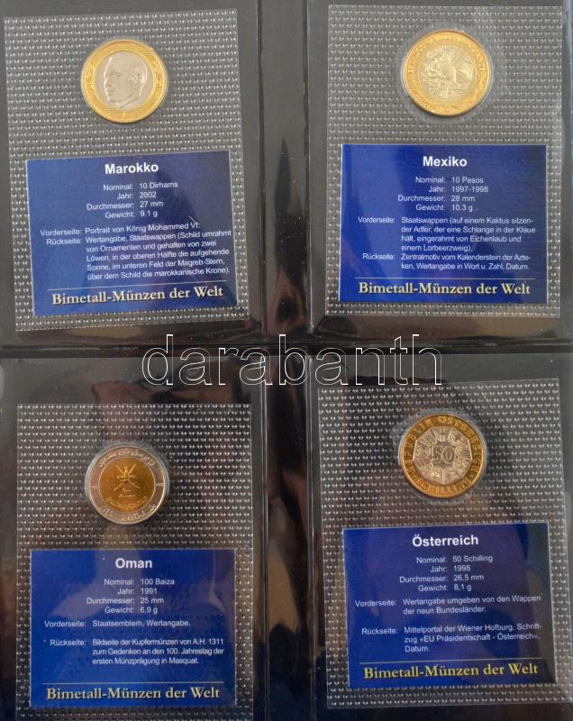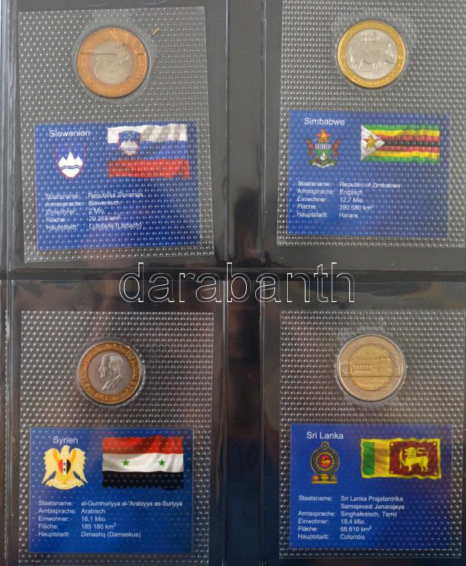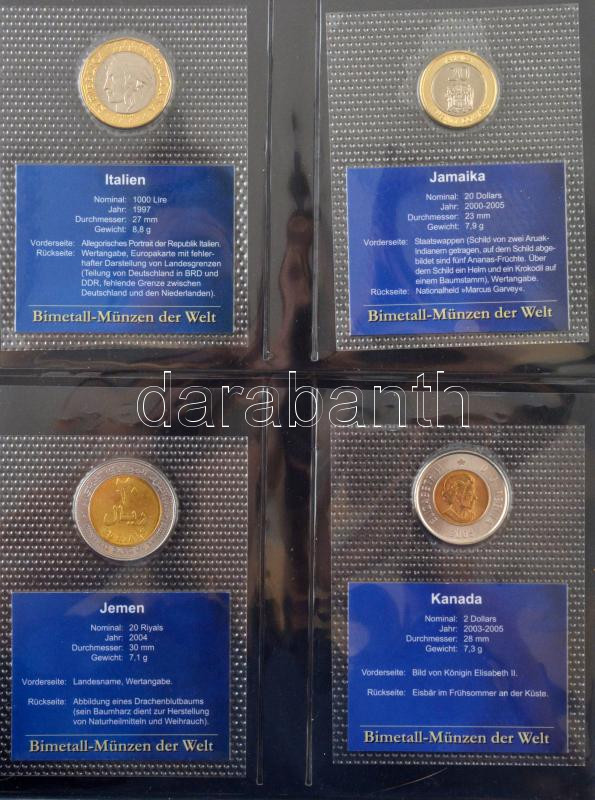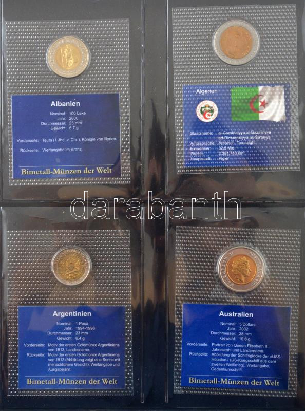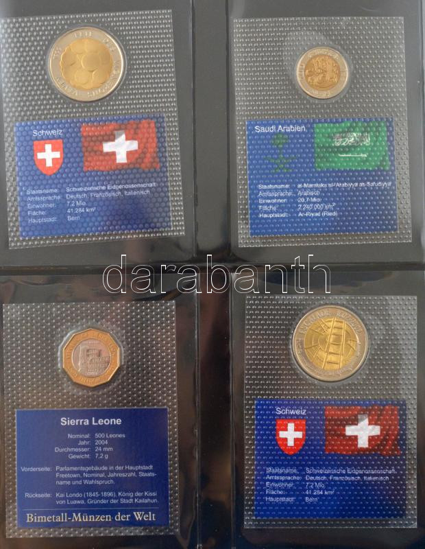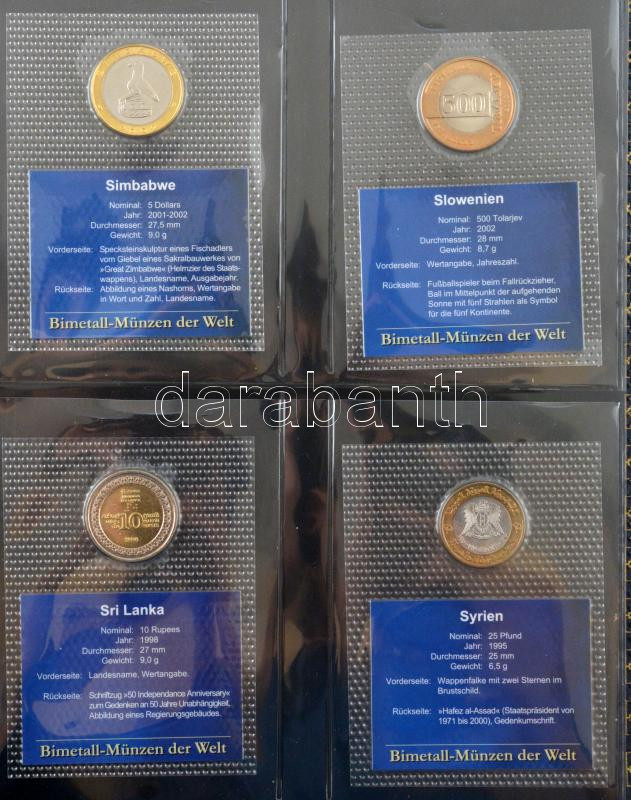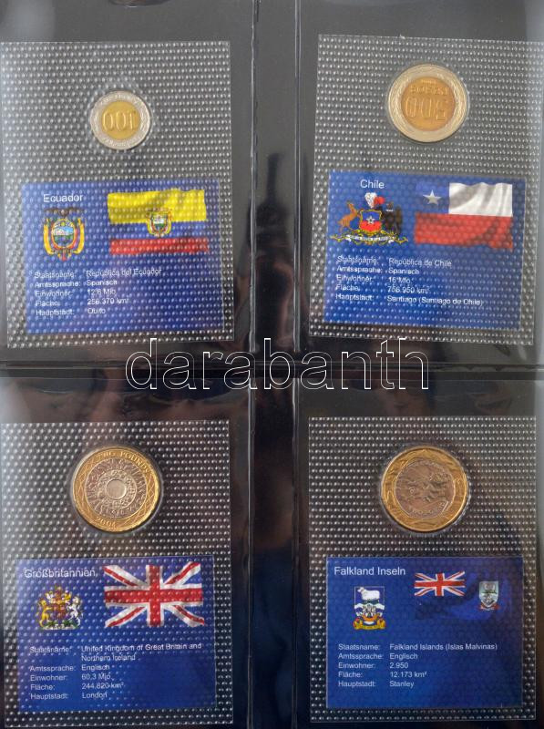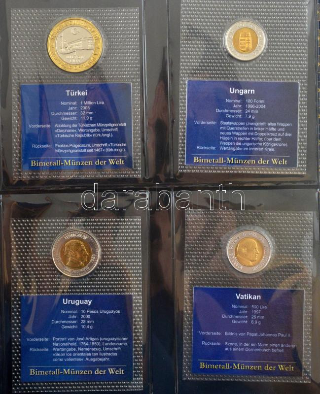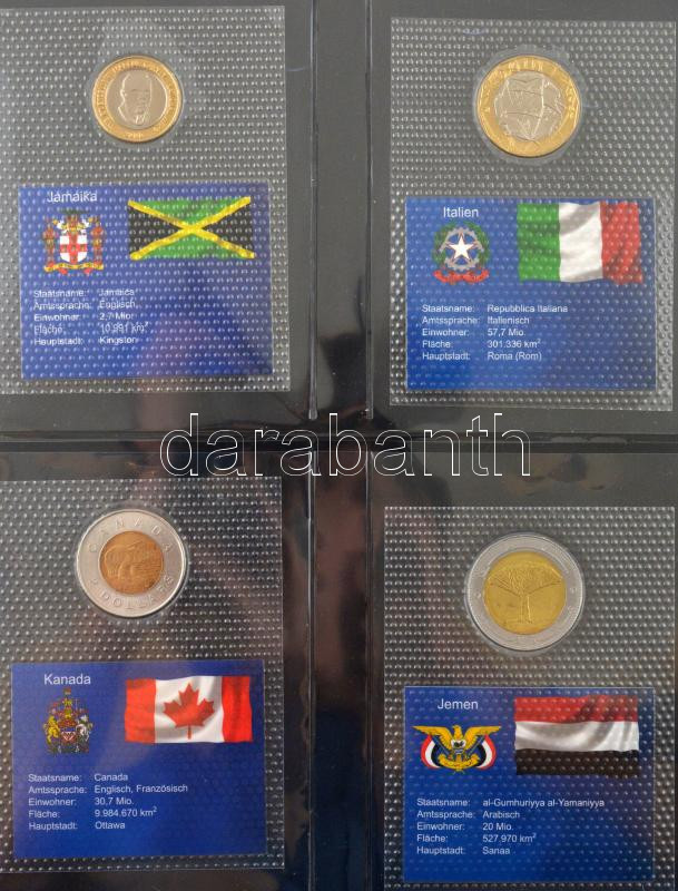 1991-2005. "A világ bimetál pénzei" 45 ország 48db különböző érméje mindegyik külön, zárt fóliatokban és német nyelvű leírással, eredeti Leuchtturm "World Money" négygyűrűs mappában, az alábbi országokat tartalmazva: Albánia, Algéria, Argentína, Ausztrália, Bahrain, Bolívia, Bulgária, Bosznia-Hercegovina, Chile, Ecuador, Falkland-szigetek, Nagy-Britannia, Hongkong, Indonézia, Irán, Izrael, Olaszország, Jamaika, Jemen, Kanada, Kazahsztán, Libéria, Luxemburg, Makaó, Marokkó, Mexikó, Omán, Ausztria, Lengyelország, Portugália, Oroszország, San Marino, Szaúd-Arábia, Svájc, Sierra Leone, Zimbabwe, Szlovénia, Srí Lanka, Szíria, Tajvan, Thaiföld, Törökország, Magyarország, Uruguay, Vatikán T:UNC,AU / 1991-2005. "Bimetallic Money of the World" 48 different coins from 45 different countries, each in separate foil packing and with a description in German, in original Leuchtturm "World Money" four-ring folder, coins from the following countries: Albania, Algeria, Argentina, Australia, Bahrain, Bolivia, Bulgaria, Bosnia and Herzegovina, Chile, Ecuador, Falkland Island, Great Britain, Hong Kong, Indonesia, Iran, Israel, Italy, Jamaica, Yemen, Canada, Kazakhstan, Liberia, Luxembourg, Macao, Morocco, Mexico, Oman, Austria, Poland, Portugal, Russia, San Marino, Saudi Arabia, Switzerland, Sierra Leone, Zimbabwe, Slovenia, Sri Lanka, Syria, Taiwan, Thailand, Turkey, Hungary, Uruguay, Vatican C:UNC,AU
