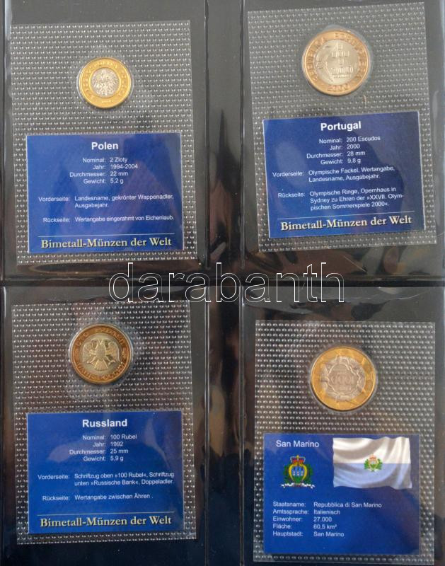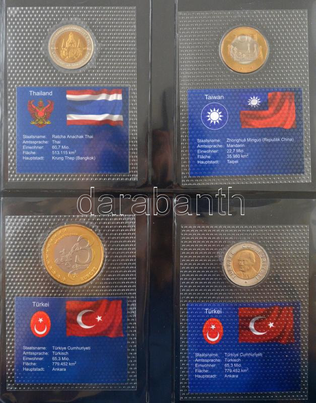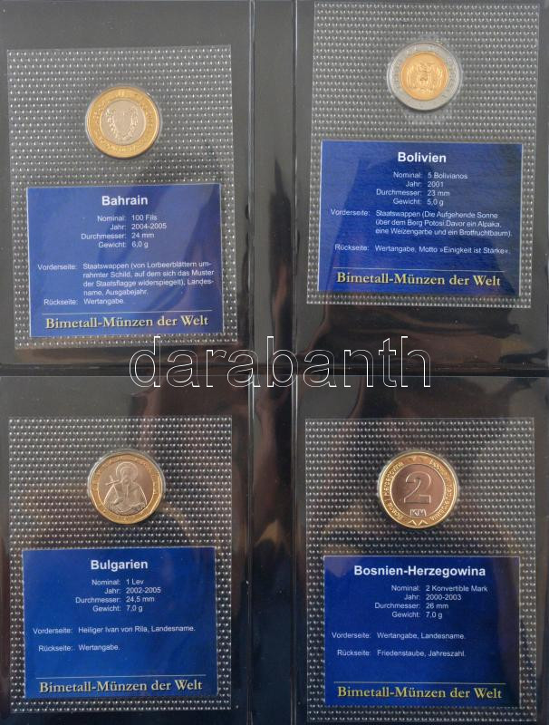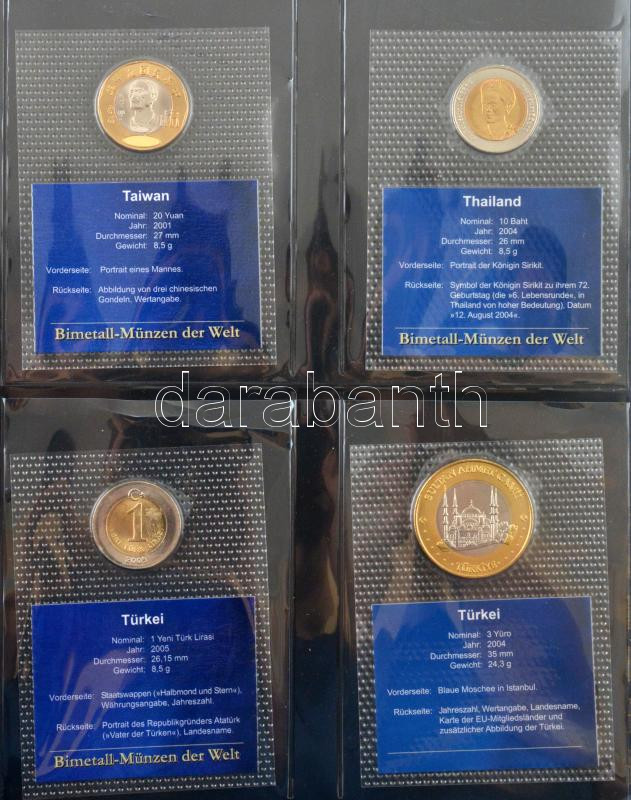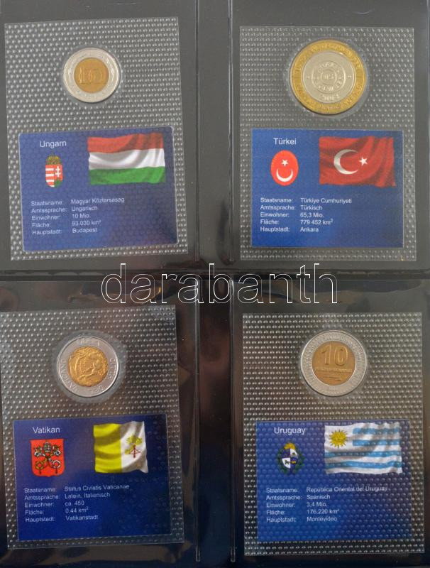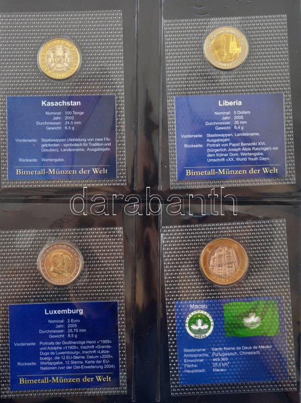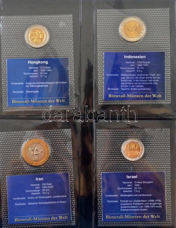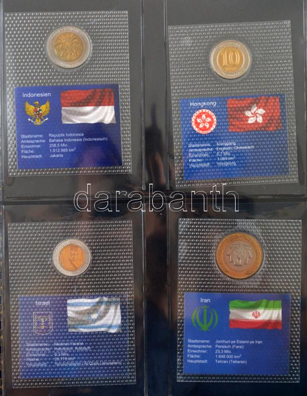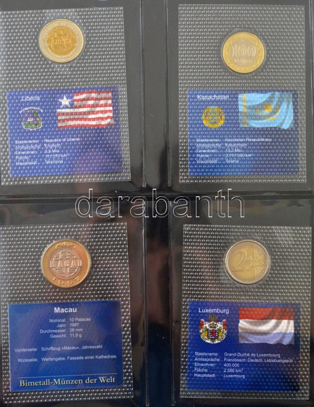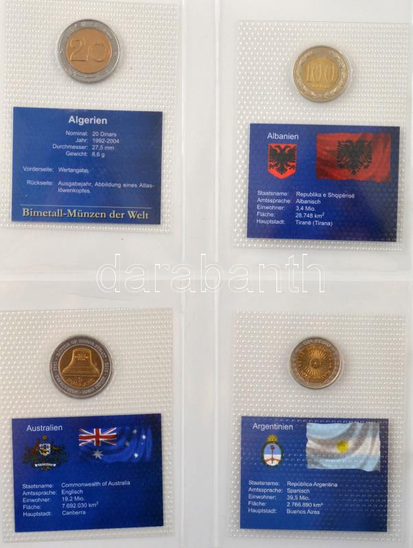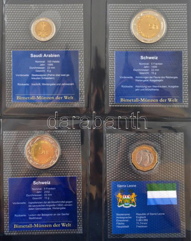 1991-2005. "A világ bimetál pénzei" 45 ország 48db különböző érméje mindegyik külön, zárt fóliatokban és német nyelvű leírással, eredeti Leuchtturm "World Money" négygyűrűs mappában, az alábbi országokat tartalmazva: Albánia, Algéria, Argentína, Ausztrália, Bahrain, Bolívia, Bulgária, Bosznia-Hercegovina, Chile, Ecuador, Falkland-szigetek, Nagy-Britannia, Hongkong, Indonézia, Irán, Izrael, Olaszország, Jamaika, Jemen, Kanada, Kazahsztán, Libéria, Luxemburg, Makaó, Marokkó, Mexikó, Omán, Ausztria, Lengyelország, Portugália, Oroszország, San Marino, Szaúd-Arábia, Svájc, Sierra Leone, Zimbabwe, Szlovénia, Srí Lanka, Szíria, Tajvan, Thaiföld, Törökország, Magyarország, Uruguay, Vatikán T:UNC,AU / 1991-2005. "Bimetallic Money of the World" 48 different coins from 45 different countries, each in separate foil packing and with a description in German, in original Leuchtturm "World Money" four-ring folder, coins from the following countries: Albania, Algeria, Argentina, Australia, Bahrain, Bolivia, Bulgaria, Bosnia and Herzegovina, Chile, Ecuador, Falkland Island, Great Britain, Hong Kong, Indonesia, Iran, Israel, Italy, Jamaica, Yemen, Canada, Kazakhstan, Liberia, Luxembourg, Macao, Morocco, Mexico, Oman, Austria, Poland, Portugal, Russia, San Marino, Saudi Arabia, Switzerland, Sierra Leone, Zimbabwe, Slovenia, Sri Lanka, Syria, Taiwan, Thailand, Turkey, Hungary, Uruguay, Vatican C:UNC,AU