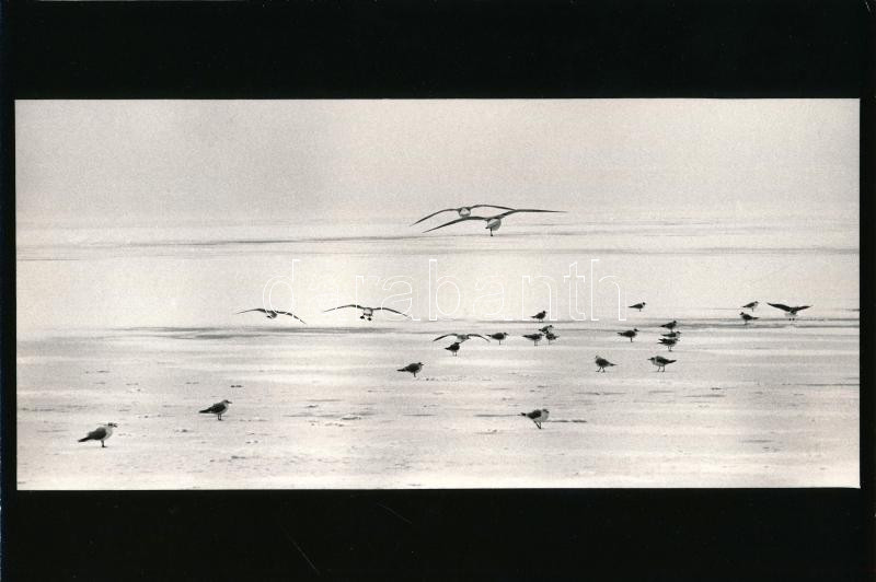 Description: 1985 Vincze János (1922-1999) kecskeméti fotóművész hagyatékából, feliratozott vintage fotóművészeti alkotás (Sirályok a Balaton jegén), ezüst zselatinos fotópapíron, 16x23,8 cm