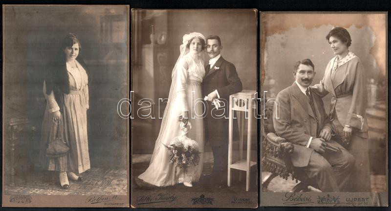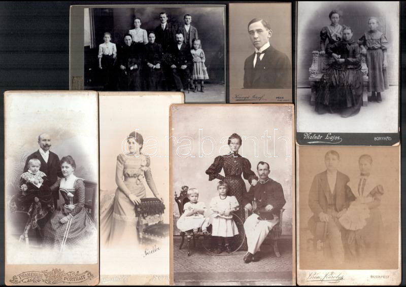 cca 1890 - 1915 Vegyes fotó tétel, nagyrészt "csonka-magyarországi" műtermek keményhátú fotói, de közte 1 nagykikindai is, összesen 16 db keményhátú fotó, 3 fotón bejegyzéssel, porté és családfotók, a személyeken divatos ruhákkal, valamint 2 db fotólap is (az egyik 1926-os), változó állapotban, közte karcos, foltos, az egyik alja vágott, közte 21x13 cm és 10x6 cm közötti méretben