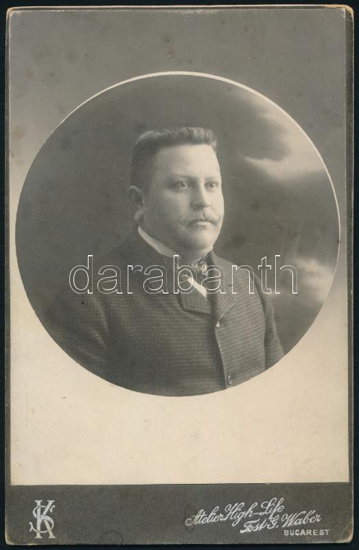 cca 1900 Úr portréja, keményhátú kabinetfotó, bukaresti műteremből (Atelier High-Life Fost. G. Waber), kissé foltos, 16,5x10,5 cm / Gentleman's portrait, cabinet card from Atelier High-Life Fost. G. Waber, Bucharest (Bucuresci, Calea Victoriei 29.), slightly stained, 16.5x10.5 cm