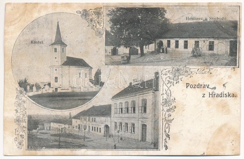 Hradisko (Kromeríz), Kostel, Hostinec u Svobodu, Skola / church, inn, school. Art Nouveau, floral (cut)