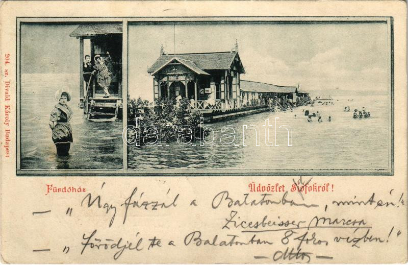 1900 Siófok, fürdőház korabeli fürdőruhás hölgyekkel. Divald Károly 204.