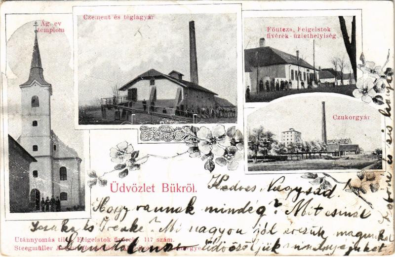 Description: 1903 Bük, Evangélikus templom, Cement és téglagyár, Cukorgyár, Fő utca, Feigelstok fivérek üzlete és saját kiadása. Steegmüller Arthur fényképész felvétele, Art Nouveau, floral (fl)