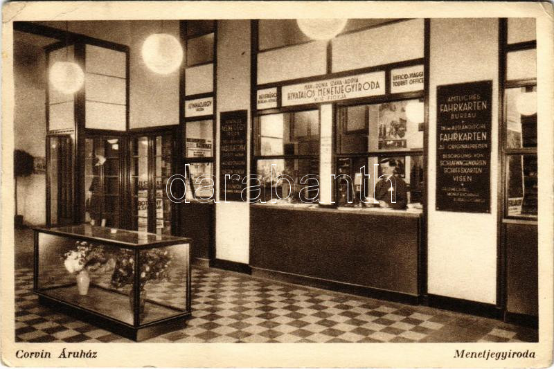 Budapest VIII. Corvin áruház belső, MÁV és Duna-Száva-Adria hivatalos menetjegyiroda VI. sz. fiókja, színházjegy iroda (EK)