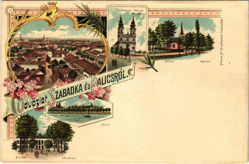 Szabadka, Subotica; Palicsi kápolna, fürdő és kávéház, látkép, Terézia templom. Piesch M. fényképész / general view, spa, café, chapel and bath in Palic, church. Art Nouveau, floral, litho (r)