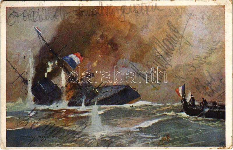 Description: 1917 Sinken des von den Dardanellenforts beschossenen französischen Panzerkreuzers "Bouvet". K.u.K. Kriegsmarine / WWI Austro-Hungarian Navy art postcard, Battle of Gallipolli, sinking French armored cruiser "Bouvet". Offizielle postkarte des Österreichischen Flottenvereines zu Gunsten des Kriegsfürsorgeamtes, des Kriegshilfsbüro und des Roten Kreuzes s: Harry Heusser (EK)