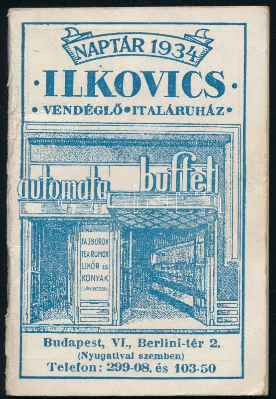 1934 Ilkovics vendéglő, italáruház, Bp., Berlini tér 2. (Nyugatival szemben), előjegyzési naptár néhány italreklámmal és vonat menetrenddel, számos érdekes ceruzás bejegyzéssel feltehetően Kézdi-Kovács Lenke, Kézdi-Kovács László (1864-1942) festőművész, műkritikus lányától, Sárdy Brutus (1892-1970) festőművész, restaurátor feleségétől.