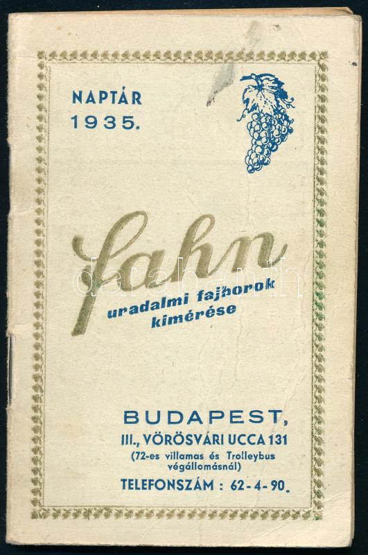 1935 Fahn uradalmi fajborok kimérése, Bp., III., Vörösvári ucca 131, előjegyzési naptár néhány italreklámmal, számos érdekes ceruzás bejegyzéssel feltehetően Kézdi-Kovács Lenke, Kézdi-Kovács László (1864-1942) festőművész, műkritikus lányától, Sárdy Brutus (1892-1970) festőművész, restaurátor feleségétől, borítón apró folttal