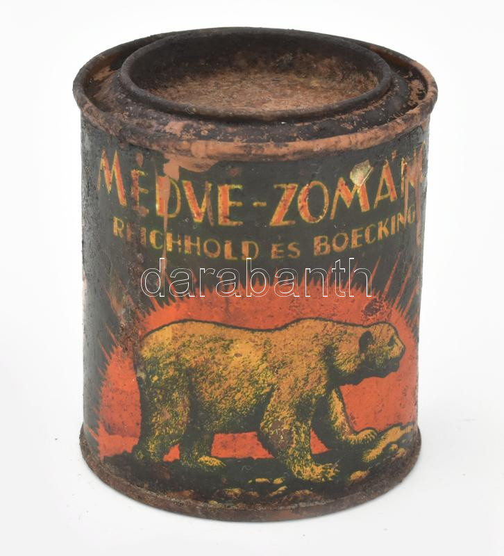cca 1930 Reichhold és Bocking, Győr - Medve-zománc fémdoboz, megviselt...