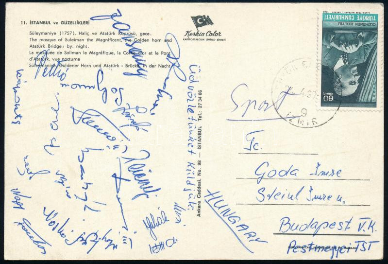 Az újpesti futballisták aláírása képeslapon (Káposzta, Bene, Fazekas, Nagy, stb.)