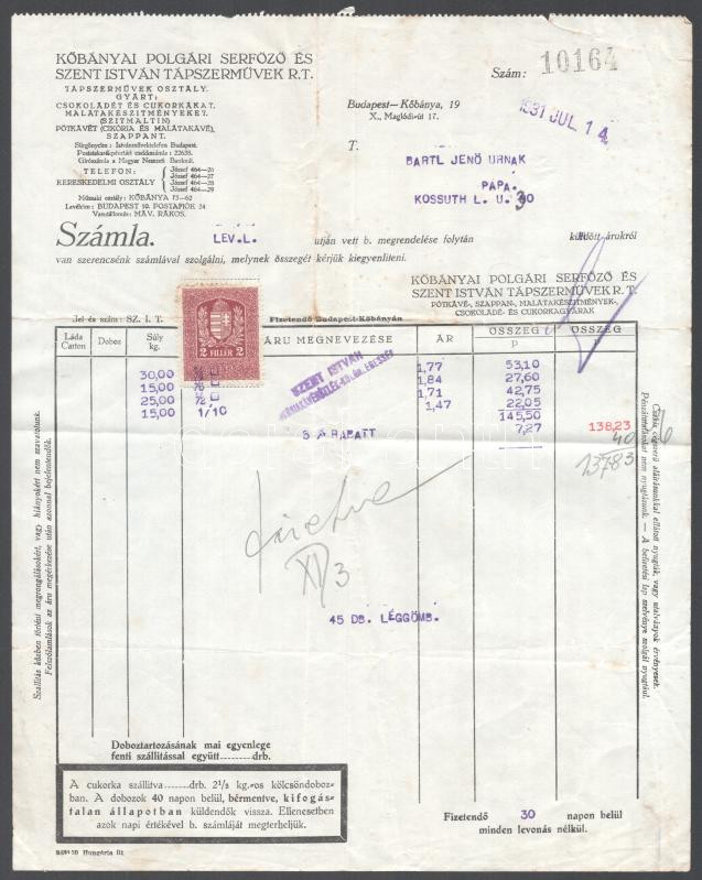 1931 Kőbányai Polgári Serfőző és Szent István Tápszerművek R.T. fejléces számla