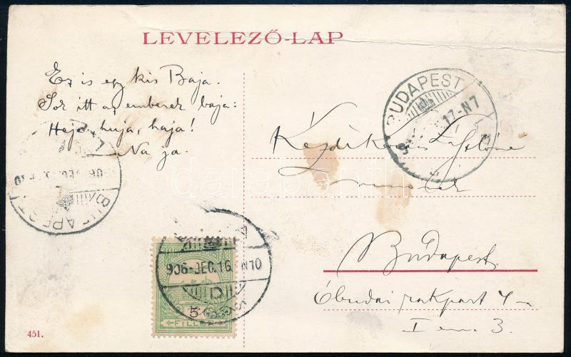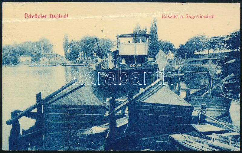 1906 Kézdi-Kovács László (1864-1942) festőművész, műkritikus autográf humoros verses sorai Baja városáról, a Sugovicán DDSG hajót ábrázoló képeslap hátoldalán.