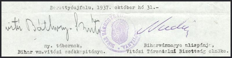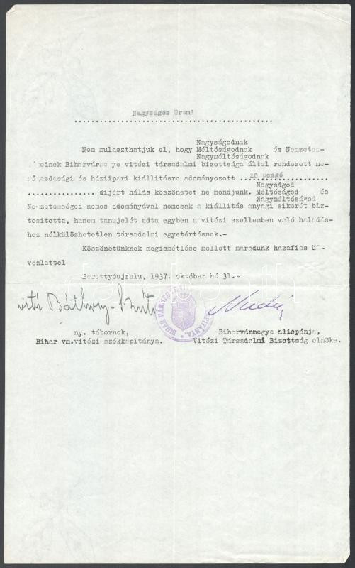 Description: 1937 Berettyóújfalu, vitéz Báthory-Szűts Sándor ny. tábornok, Bihar vármegye vitézi székkapitányának aláírásával és bélyegzőjével ellátott köszönő levele, Lichtschein Samu izraelita földbirtokos részére