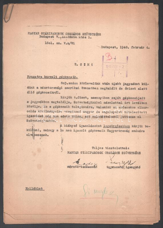 1948 Magyar Gyáriparosok Országos Szövetségének gépelt dokumentuma a nyugatra hurcolt gépkocsik tárgyában, 12 p.