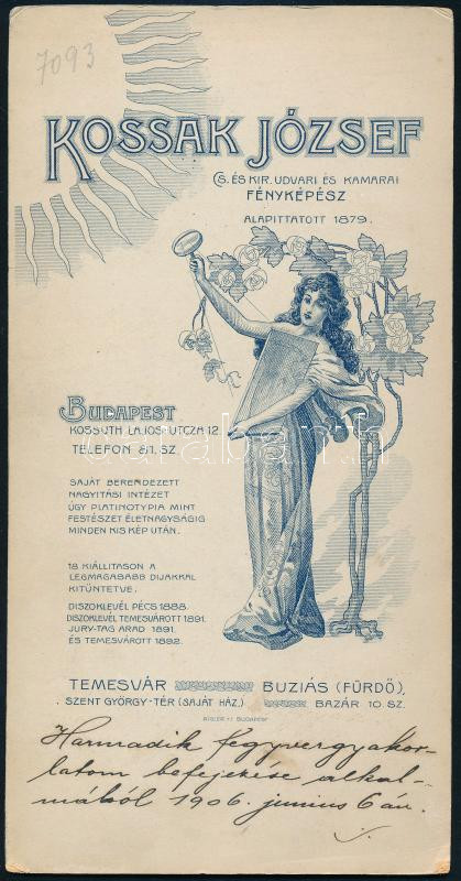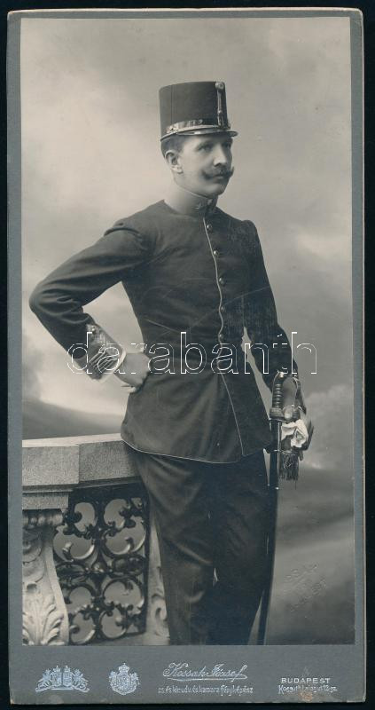 Description: 1906 Cs. és kir. gyalogsági tiszt portréja (1861M gyalogostiszti szablyával), keményhátú kabinetfotó Kossak József budapesti műterméből, hátoldalán autográf sorokkal, 21x10,5 cm