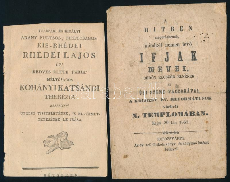 1804 Császári és királyi arany kultsos, méltóságos Kis-rhédei Rhédei Lajos úr' kedves élete párja' méltóságos Kohányi Kátsándi Therézia aszszony' utólsó tiszteletének, 's el-temettetésének le írása. [Kis-rhédey gróf Rhédey Lajos cs. és kir. kamarás, főispáni helytartó, országgyűlési követ felesége, Kohányi Kácsándy Terézia temetéséről írt beszámoló (megjelent a Magyar Kurir 1804. május 15-i számában) különlenyomata]. Bétsbenn, [1804], ny.n., 8 p. Kissé sérült, fűzés nélkül, körbevágott lapokkal. + 1855 A hitben megerősítendő, mindkét nemen levő ifjak nevei, midőn előszőr élnének az úri szent vacsorával, a kolozsv. ev. reformátusok várbeli n. templomában. Kolozsvártt, 1855, Az ev. ref. főiskola könyv- és kőnyomó intézet-ny., 2 sztl. lev. Foltos, kissé viseltes állapotban.