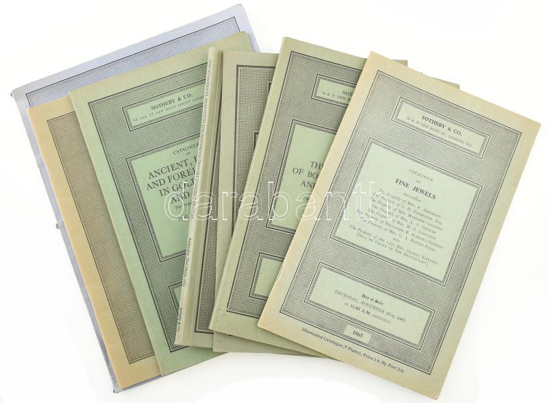 1965-1985 Sotheby katalógusok, 7 db: Catalogue of Fine jewels (1965), Catalogue of The collection of books on cookery and gastronomy (1966), Catalogue of Old master paintings (1972), Catalogue of Fine seventeenth, eigteenth and nineteenth century English paintings (1972), Catalogue of Ancient, English and foreign coins, in gold, silver and bronze (1973), Catalogue of Impressionist and modern paintings, drawings, watercolours and sculpture (1975), Catalogue of Fine English and continental furniture. Metalwork and works of art. Antiquarian and modern books, original illustrations and maps. British and continental enamels, glass and ceramics. Oriental ceramics, works of art and furniture. Eastern carpets and rugs. (1985.) Változó állapotban.