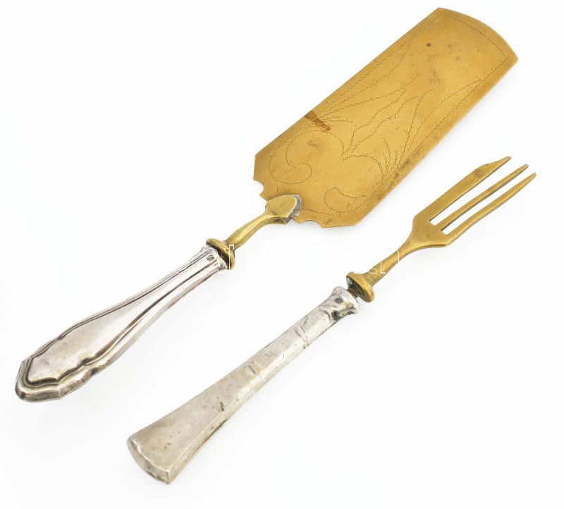 Ezüst (Ag) nyelű tortalapát és villa, jelzéssel, h: 15-20 cm, bruttó: ...