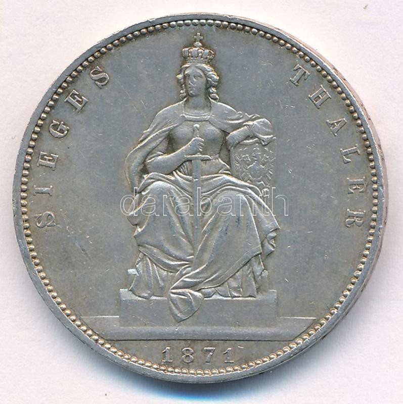 Német Államok / Poroszország 1871A Tallér Ag "I. Vilmos / Győzelmi tal... https://www.darabanth.com/en/446-Online-auction/446.0/Numismatics/Worldwide-silver-and-metal-coins~1500017/Nemet-Allamok-Poroszorszag-1871A-Taller-Ag-I-Vilmos-Gyozelmi-taller-18-56g-TVF-ph-~II2950652