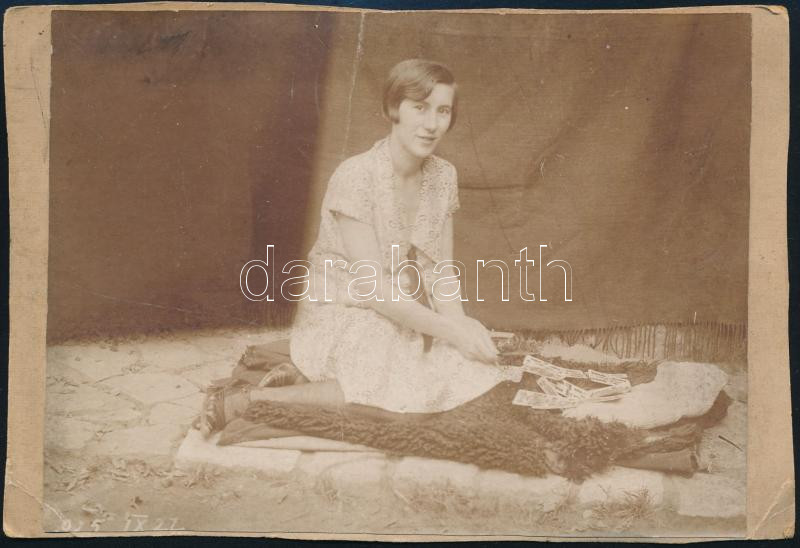 1925 Hölgy kártyával a földön, keményhátú fotó, 11,5×16,5 cm