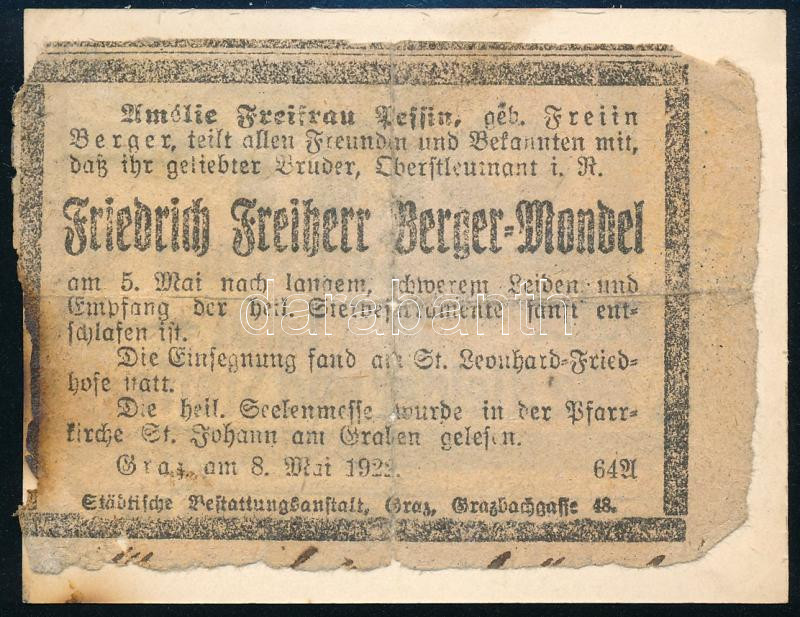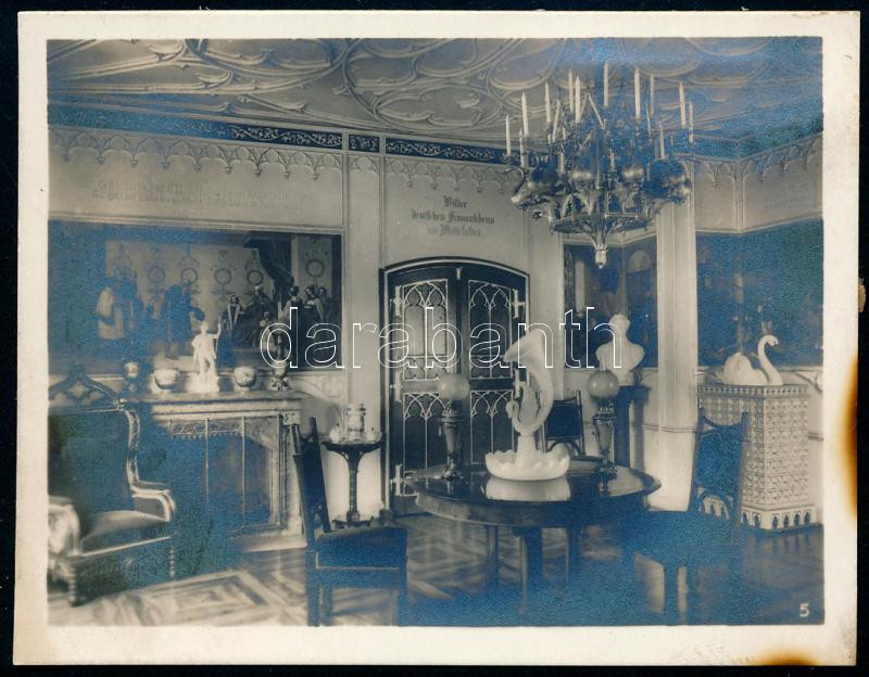 Description: cca 1923 Azonosítatlan helyszín enteriőr fotója, a falon német nyelvű felirattal: "Bilder Deutsches Frauenleben im Mittelalter." A hátoldalon grazi főhadnagy halálozási értesítőjével: Friedrich Freiherr Berger-Mondel. A soproni Czullik Ágost, az oroszvári kertészet alapítójának és tulajdonosának, a Liechtenstein hercegi kertek igazgatója családjának hagyatékából, 7x9 cm