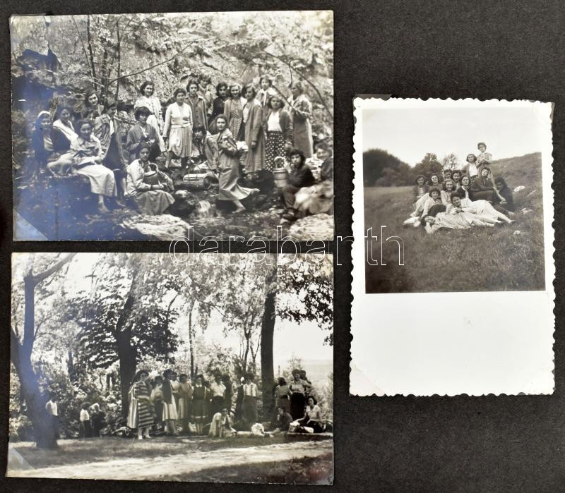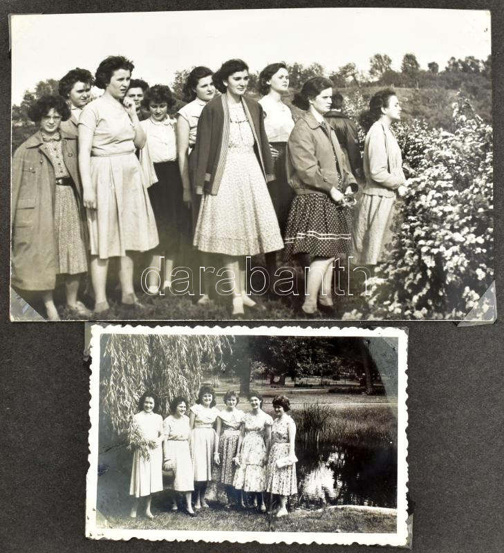 Description: cca 1955-1960 A Róm. kat. Svetits Ált. Leánygimnázium 1960-ban végzett osztályának fényképalbuma, benne közös utazások, kirándulások fotóival, tablófotóval, stb.; összesen kb. 80-100 db fotó, korabeli zsinórfűzéses albumban, 17x22,5 cm