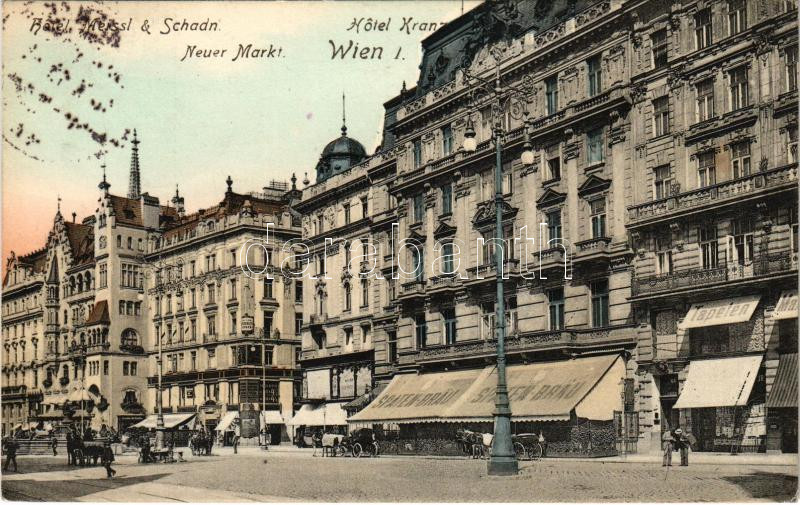 1915 Wien, Vienna, Bécs; Hotel Meissl & Schadn, Neuer Markt, Hotel Kranz / hotels, market, shops (EK)