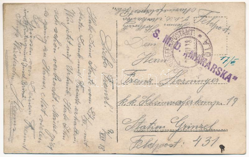1918 S.M.K.D. Makarska - K.u.k. Kriegsmarine U-Such Flotille / SMD Makarska cs. és kir. haditengerészet tengeralattjáró elhárító / Austro-Hungarian Navy submarine search ship. photo + "K.u.K. Marinefeldpostamt Pola" + S.M.D. ,,MAKARSKA"
