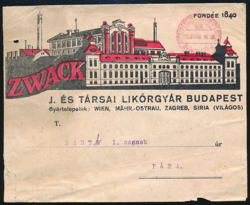 1929 Zwack J. és Társai Likőrgyár céges boríték
