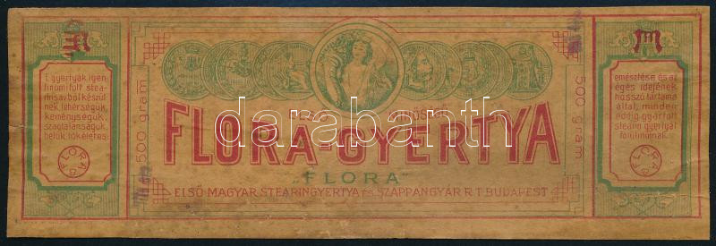 cca 1930 Első minőségű Flora-gyertya csomag-ragaszték, 17x5,5cm, Első Magyar Stearingyertya-és Szappangyár Rt.