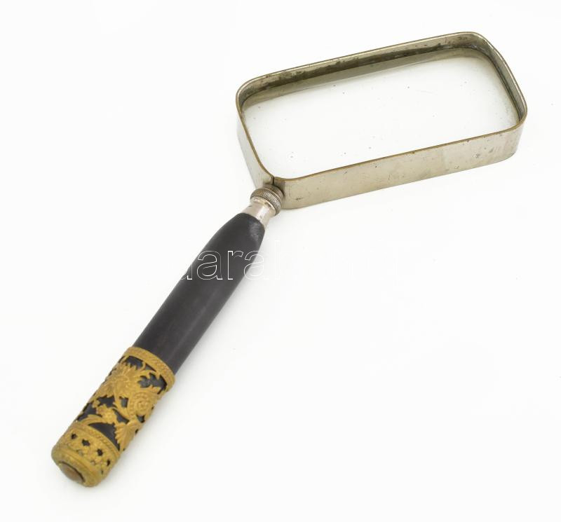 Téglalap alakú antik nagyító, díszes réz verettel, sérüléssel, h: 21 c...