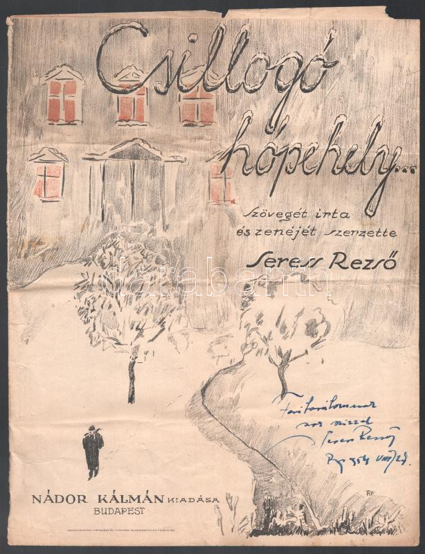 1954 Seress Rezső (1899-1968) zeneszerző, zongorista autográf dedikációja Csillogó hópehely c. kottája borítóján. (Bp., (1928,Nádor Kálmán, hajtott, a 2. lap sarkán hiánnyal, 2. sztl. lev. )