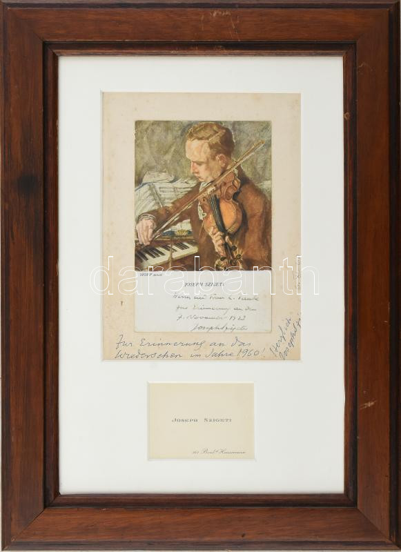 Description: Szigeti József (1892-1973), világhírű hegedűművész autográf sorai és aláírása saját magát ábrázoló képeslapon az 1920-as évekből, további autográf sorai és aláírása képeslapot tartó kartonon és névjegykártyája, egy üvegezett fakeretben, keretezett méret 36x26 cm