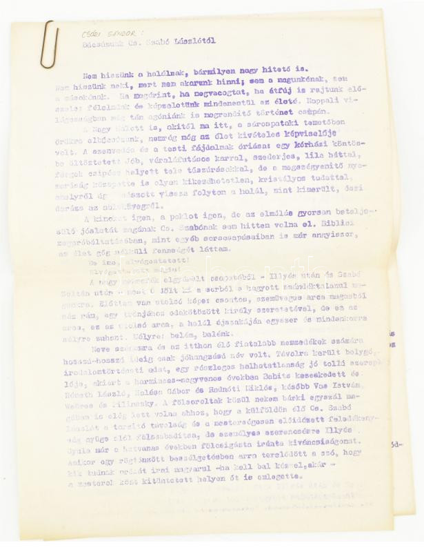 Csoóri Sándor: Búcsúzunk Cs. Szabó Lászlótól. Cs. Szabó László (1905-1984) Kossuth-díjas író, kritikus temetésére írt gyászbeszéd, 5 gépelt oldal