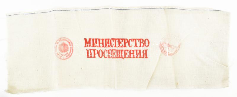 Description: cca 1945 "Ministerstvo Prosvesheniya" (Oktatási Minisztérium), orosz nyelvű felirattal ellátott karszalag az 1945-ben a szovjetek által megszállt Budapestről, rajta "M. kir. Vallás- és Közoktatásügyi Minisztérium Elnökség" feliratú, magyar címeres, illetve orosz nyelvű "Oktatási Minisztérium Budapest" pecsétekkel. 40x14 cm