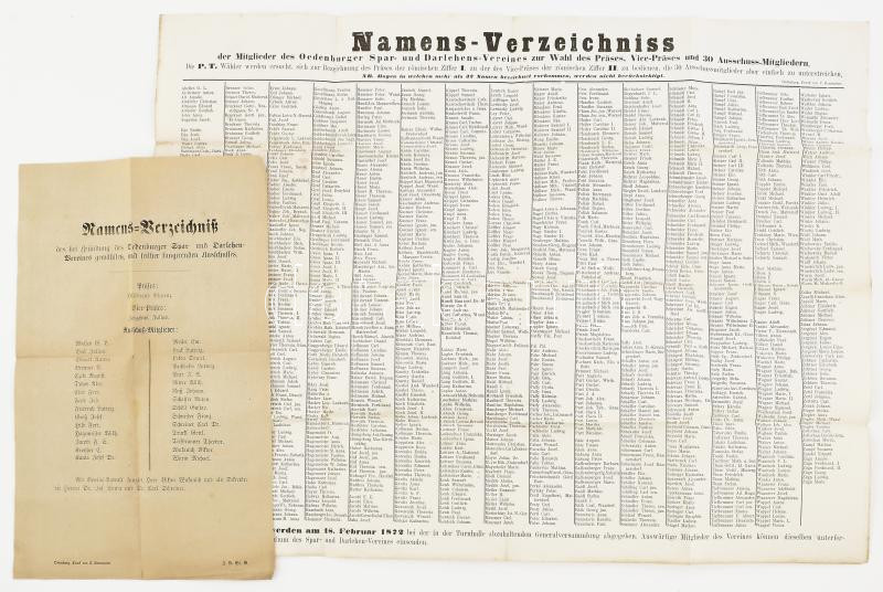1872 A Soproni Takarék- és Kölcsön-Egylet tagnévsora és bizottsági tagnévsora, 2 db német nyelvű nyomtatvány, 44x58 cm, 34x21 cm