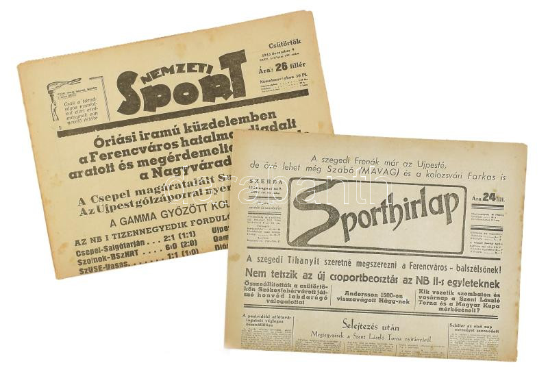 Description: 1943 Nemzeti Sport XXXV. évf. 239. sz., 1943. dec. 9., a címlapon a labdarúgó NB I aktuális híreivel, eredményeivel (Ferencváros-Nagyvárad mérkőzés, stb.) + 1944 Sporthírlap XXXV. évf. 63. sz., 1944. aug. 9.