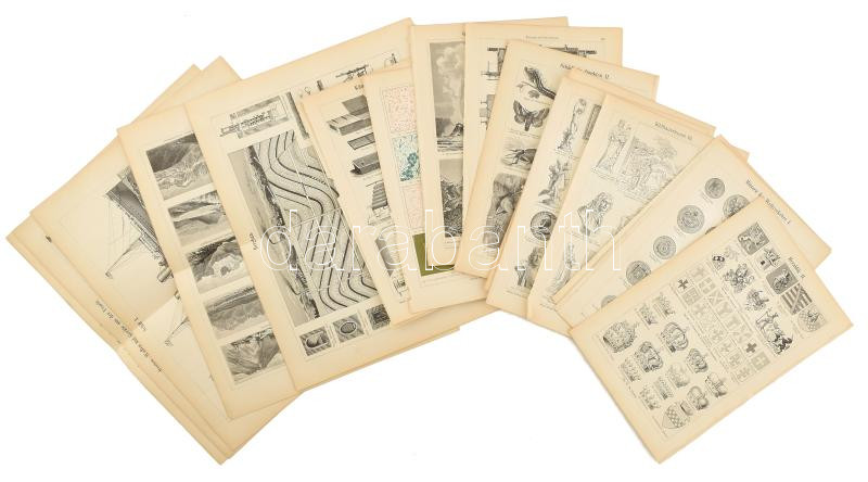 Description: ca 1898 össz. 19 db vegyes témájú (anatómia, hajózás, heraldika, numizmatika stb.) illusztráció a Meyers Kleines Konversations-Lexikon 6. kiadásából. Nyomat, papír. Lap széle részben kissé sérült. 21x26 és 21x13 cm