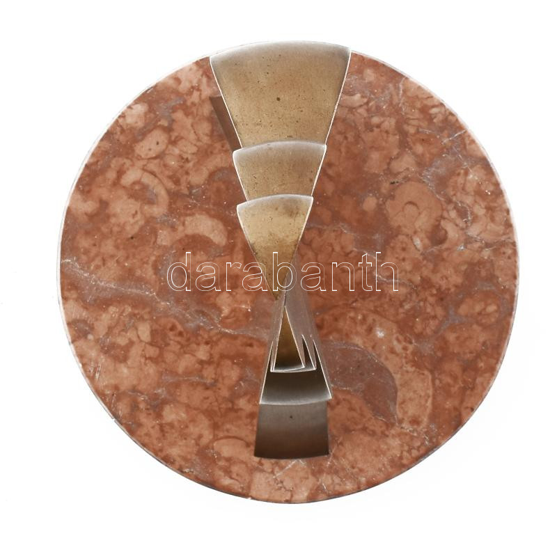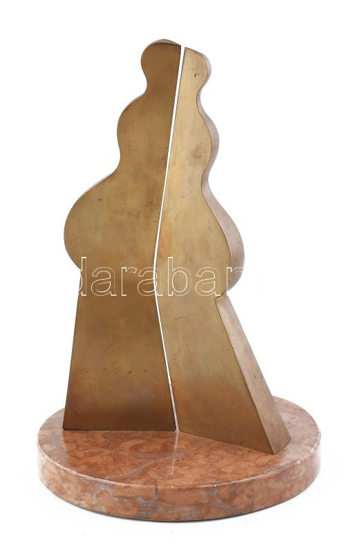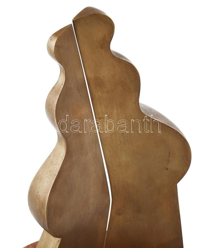 Deim Pál (1932-2016): Bábu. Patinázott bronz, márvány talapzaton. Jelzés nélkül. d: 17,5 cm, m: 26,5 cm Deim Pál művészetében, a stilizált bábu az egyik legjellegzetesebb motívuma, amely mint egy embernek a emlékműve, mely térsíkok közé van szorítva, jelenik meg, mind a festészetében úgy a kisplasztikáin is. Foglalkoztatta a magányosság és az emberben lévő kettősség és a világban helyét kereső ember kérdése is. Barcsay Jenő és Vajda Lajos művészete egyszerre inspirálta. Talapzat alján a felfogatásnál a márványon hiányok.