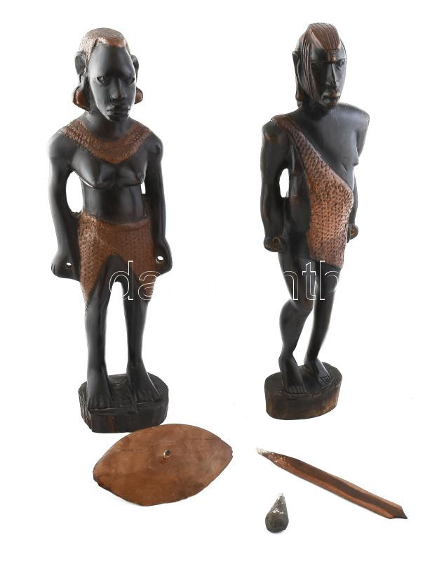 Description: Maszáj férfi és nő, afrikai fafaragás, 2 db szobor, törzsi öltözetben, kezükben pajzzsal és fegyverekkel (egy hiányzik, egy rögzítésre szorul). Jelzés nélkül, szárm. hely: Kenya, m: 44 - 45 cm