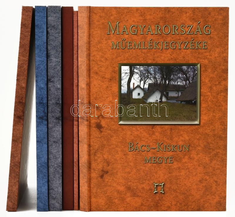 Magyarország műemlékjegyzéke könyvsorozat 6 kötete: Bács-Kiskun,Jász-Nagykun-Szolnok, Komárom-Esztergom, Fejér, Zala, Tolna megye. Kulturális Örökségvédelmi Hivatal, Budapest, 2005-2008. Kiadói kartonált papírkötés, illetve papírkötés. Szép állapotban.