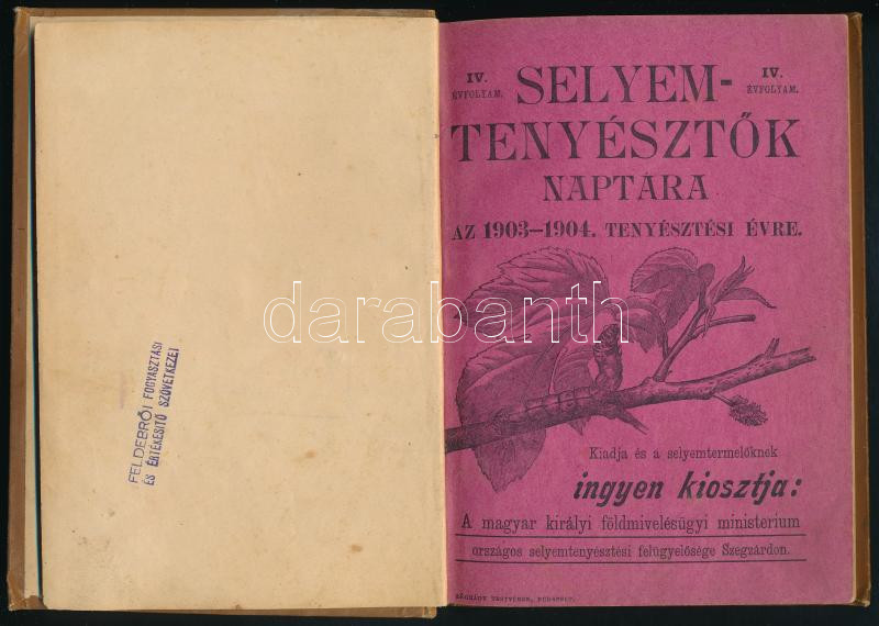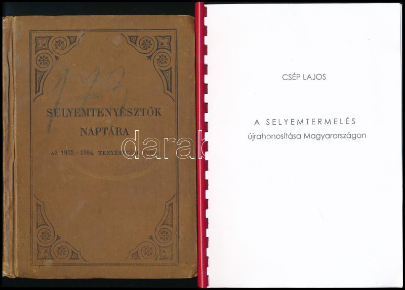 1903 Selyemtenyésztők naptára az 1903-1904. tenyésztési évre. IV. évf. Kiadja és a selyemtermelőknek ingyen kiosztja: a magyar királyi földmívelésügyi ministerium Országos Selyemtenyésztési Felügyelőség Szegzárdon. Bp.,(1903), Légrády-ny., 156+4 p. Szövegközti és egészoldalas fekete-fehér fotókkal illusztrált. Kiadói egészvászon-kötés, kopott borítóval, bélyegzésekkel. + Csép Lajos: A selyemtermelés újrahonosítása Magyarországon. Bp., 2015., Szerzői kiadás. Spirálkötésben.