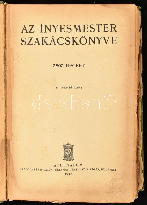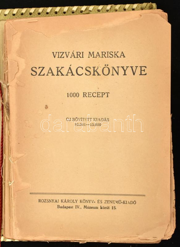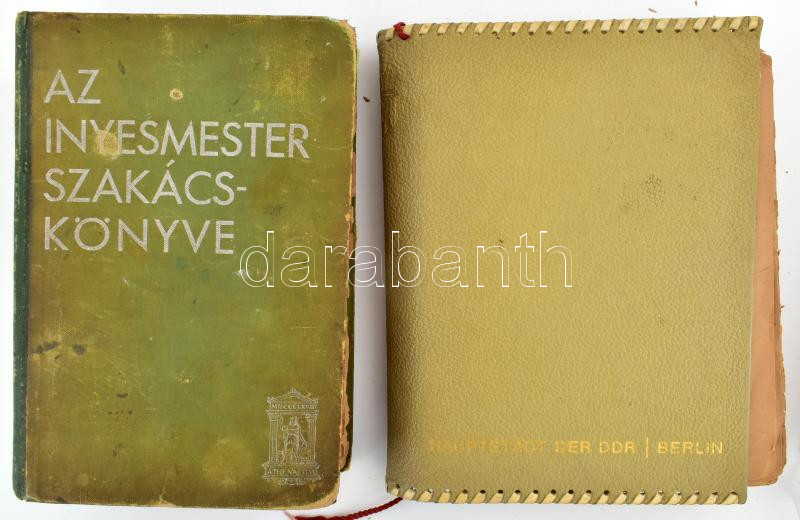 2 db régi szakácskönyv: Magyar Elek: Az ínyesmester szakácskönyve. Bp., 1932, Athenaeum, 510+1 p. 5-10.000 példány. Vászonkötés, kopott, foltos borítóval, javított, sérült gerinccel, hiányzó előzéklappal, helyenként foltos és részben kijáró lapokkal, utolsó néhány lap széle ragasztva, erősen megviselt állapotban. + Vizvári Mariska szakácskönyve. 1000 recept. Bp., 1944, Rozsnyai, 460+3 p. Kötés és gerinc nélkül, részben sérült és kijáró lapokkal, hiányzó előzéklappal, az előszó után 2 levél hiánnyal, megviselt állapotban, lazán XX. sz. második feléből származó műbőr mappában.