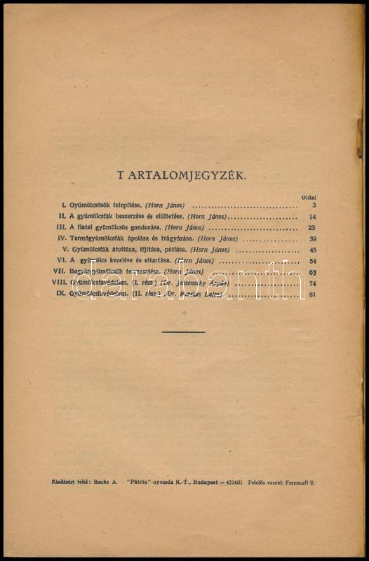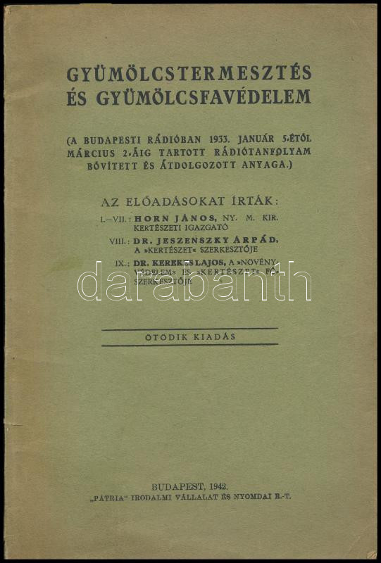 Description: Gyümölcstermesztés és gyümölcsfavédelem. (A budapesti rádióban 1933. január 5-étől március 2-áig tartott rádiótanfolyam bővített és átdolgozott anyaga. Az előadásokat írta: I-VII.: Horn János, VIII.: Dr. Jeszenszky Árpád, IX. Dr. Kerekes Lajos. Bp., 1942., Pátria, 95+1 p. Kiadói papírkötés, a gerincen kis szakadással.