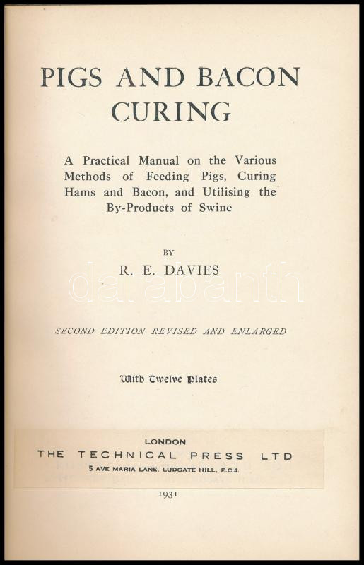 R. E. Davies: Pigs and bacon curing. [Sertés és szalonna pácolás.] Tec... https://www.darabanth.com/en/447-Online-auction/447.0/Books/Books-Gastronomy-and-Gardening~1500015/R-E-Davies-Pigs-and-bacon-curing-Sertes-es-szalonna-pacolas-Technical-Press-Manuals-Lond~II2956940