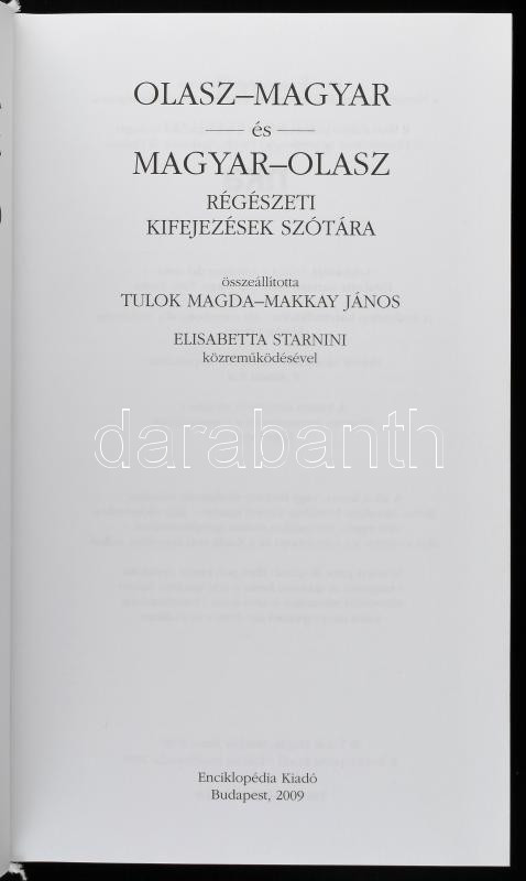 Olasz-magyar és magyar-olasz régészeti kifejezések szótára. Dizionario di terminologia archeologia Italiano-Ungherese e Ungherese-Italiano. Összeáll.: Tulok Magda - Makkay János. Elisabetta Starnini közreműködésével. Bp., 2009., Enicklopédia Kiadó. Kiadói kartonált papírkötés.