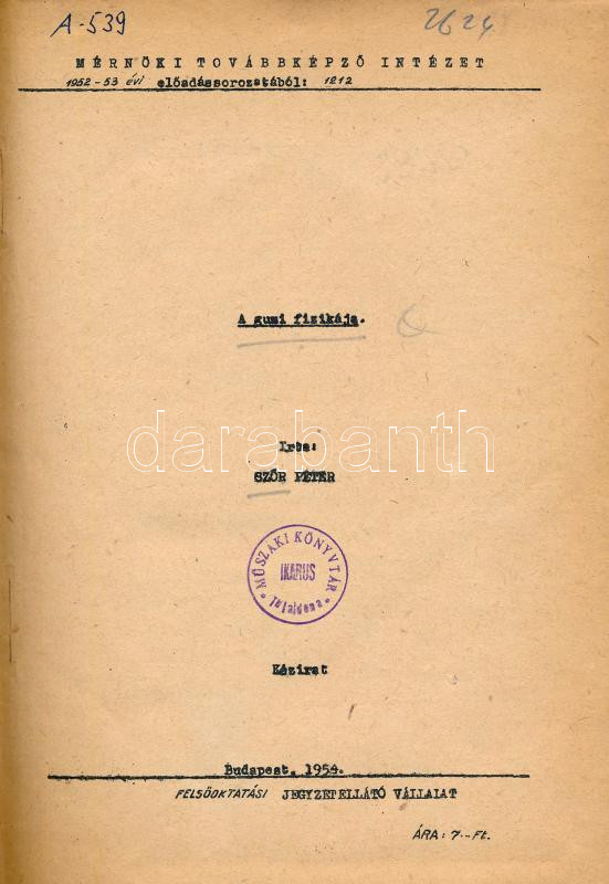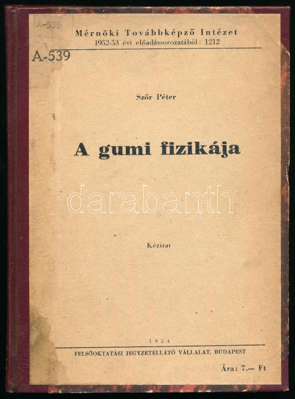 Szőr Péter: A gumi fizikája. Kézirat. Bp., 1954, Felsőoktatási Jegyzetellátó Vállalat, 62 p. Szövegközi ábrákkal illusztrálva. Átkötött félvászon-kötésben, intézményi bélyegzővel, helyenként szamárfüles lapokkal. Megjelent 70 példányban.