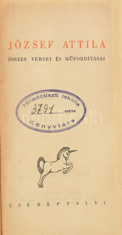 Description: József Attila összes versei és műfordításai. Sajtó alá rendezte: Bálint György. Bp., é.n. (cca 1940), Cserépfalvi, 516 p. Egészvászon-kötésben, intézményi bélyegzővel